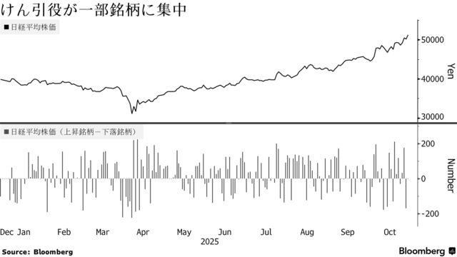 最高値を更新した日経平均株価の押し上げ役が一部銘柄に偏り過ぎており、足元の上昇相場の脆弱(ぜいじゃく)性を示している可能性がある。