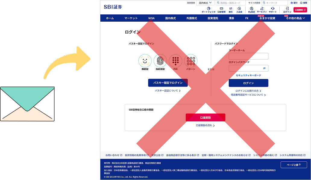当社はメールからユーザーネームやログインパスワードによる ログインを求める画面のURLを送ることはありません |